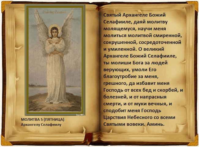 О, великий архистратиже Божий Селафииле! Ты молиши Бога за людей верующих, умоли Его благоутробие за меня, грешную, да избавит меня Господь от всех бед и болезней и от напрасныя смерти и да сподобит меня Господь Царствия Небеснаго со всеми святыми во веки веков. Аминь.