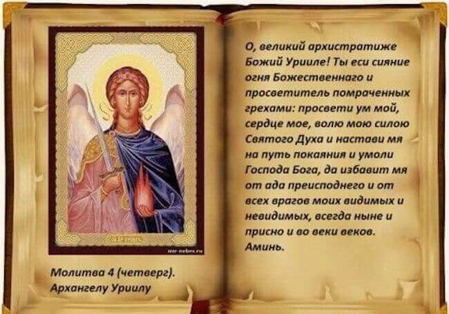 О, великий архистратиже Божий Урииле! Ты еси сияние огня Божественнаго и просветитель помраченных грехами: просвети ум мой, сердце мое, волю мою силою Святого Духа и настави мя на путь покаяния и умоли Господа Бога, да избавит мя от ада преисподнего и от всех врагов моих видимых и невидимых, всегда ныне и присно и во веки веков. Аминь.